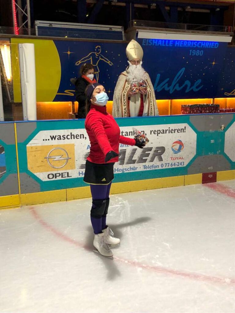 Doch die Geschenke, die der Nikolaus mitgebracht hat, mussten sich die jungen Eisläufer erst verdienen. Geduldig und mit Corona-konformem Abstand schaute sich der Nikolaus die Kunststücke der Vereinsmitglieder in der kühlen Halle an. Auf den roten Teppich wurde dieses Jahr verzichtet, so musste der Herr aus dem Morgenland dieses Jahr das Eis nicht betreten, und überreichte die Päckchen über die Bande.