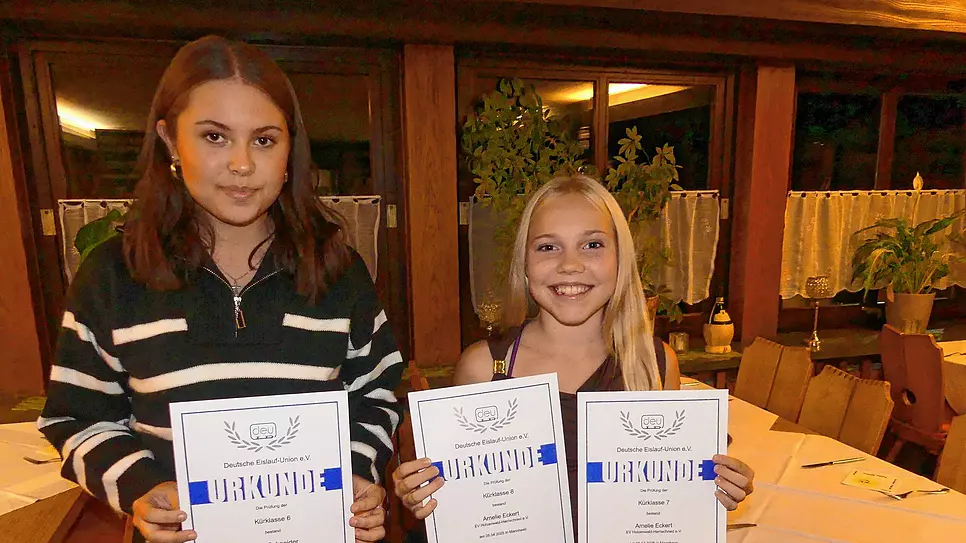 Finia Schneider (links), die die Eiskunstlauf-Klasse sechs bestanden hat, und Amelie Eckert, die 2024 die Eiskunstlauf-Klassen sieben und acht bestanden hat, freuen sich über die Ehrungen und die damit verbundene Anerkennung für ihren Einsatz. Fotos: Sigrid Schneider